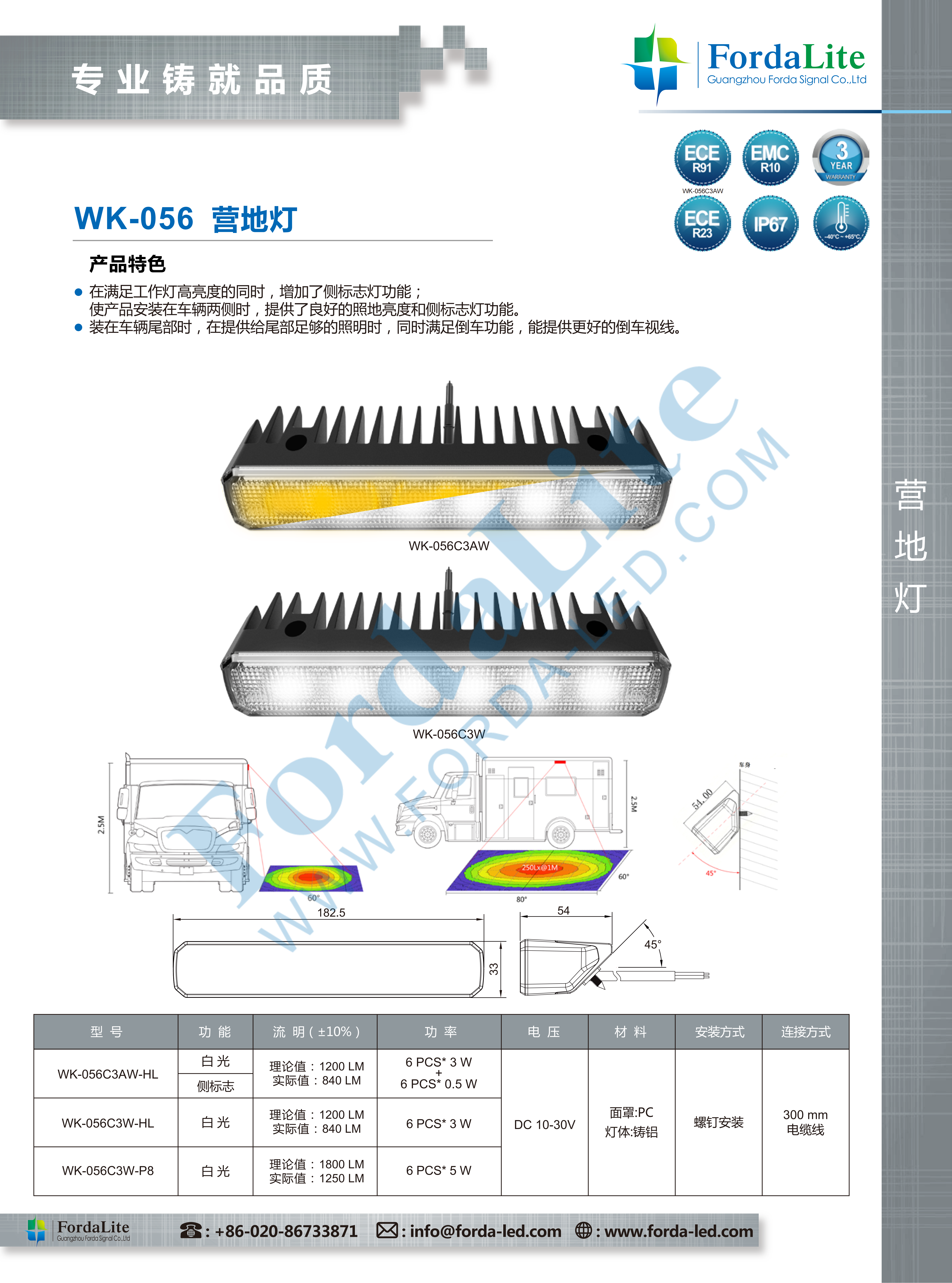使产品安装在车辆两侧时,提供了良好的照地亮度和侧标志灯功能。